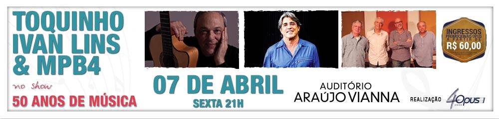 Toquinho, Ivan Lins e MPB4 apresentam o show “50 anos de música”.Na comemoração deste meio século de carreira profissional, Toquinho convida MPB4 e Ivan Lins, parceiros em vários shows realizados nos últimos anos, para uma apresentação inédita e única em Porto Alegre.